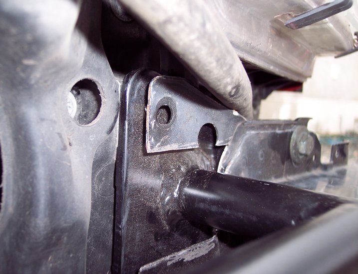 | Now we can take a look around at how the bar and intercooler fits.  First of all it's quite strange the way the intercooler only seems to hang on 2 very small bolts and it moves around a litle.  I'm hoping that the piping and bumper cover helps to steady this up.  The other thing I noticed was that the stock bumper bar had a slightly offset bolt where it bolted onto the lock carrier.  The lock carrier is the plastic part which holds the radiator.  This caused a problem for the headlight washer brackets as they would now be at a slightly strange angle from the stock position. As if they were leaning forward.  You can see the gap and offset from the 2 closeup pictures on the right.  This problem was due to the eurojet bar being flat at the back.  The other problem I could see was the newly cut headlight washer brackets which were made from the old bumper were to large and because of the height of the intercooler it meant that they were blocking the piping at each side of the core. |   |