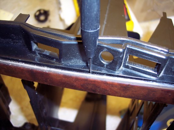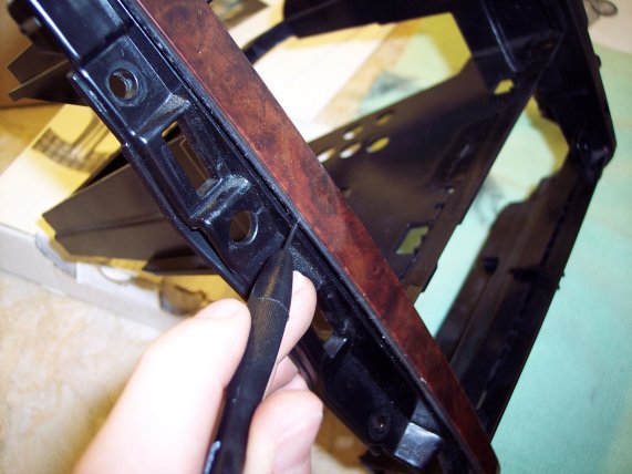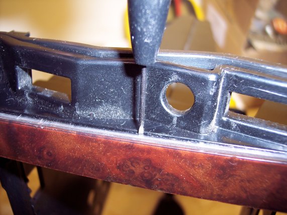 This is the trim being pushed down onto it's position on the radio cage. You can see how the small stud in the middle is pushing against the flap of plastic which can be seen more clearly on the first picture. |