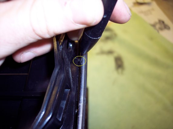 Now onto the process for taking the trim off. The best thing to use for this is a flat jewellers screwdriver or a normal very very small thin one. The first picture indicates exactly where the flap of plastic is holding the stud mentioned earlier. It's behind the trim where the tip of the screwdriver is pointing. This is an easy location to find as you can get it from using my picture as a guide, or by lining up the location from the inside edge of teh radio cage when you have the radio etc removed. The tab is located almost exactly in the middle of the double din opening. You can see this clearly in the second picture. As you can see from the process I am using i can get the screwdriver in from the outside where the glovebox or lower driver's side trim would be. It is not necessary to remove these and do it this way as the trim can be easily removed be just taking the cubby hole and radio out or whatever components are located in the radio cage. The second picture shows the tip of the screwdriver being pushed in behind the piece of trim. The idea is to get the tip exactly in the center of the trim so the plastic holding tab can be easily moved. Then we're ready to pop the trim off with a couple of simple steps. |