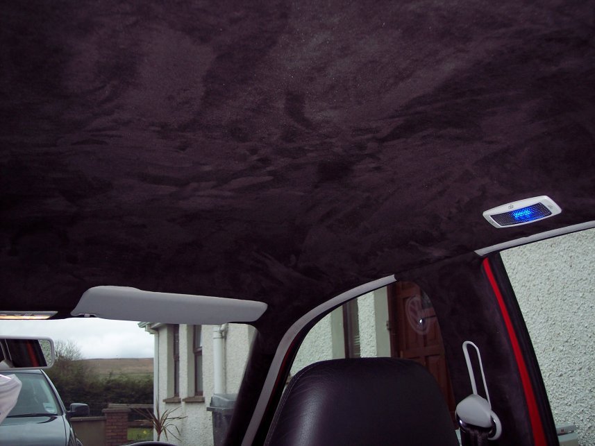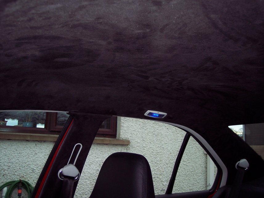 My headliner had been sitting in my garage for a long, long time. I decided it was time to go ahead and get it finished. You'll notice the filled grab handles. It was incredibly difficult to work with and not the easiest mods in the car. You can read all about it in my 'headliner' page in the bora menu. |