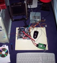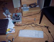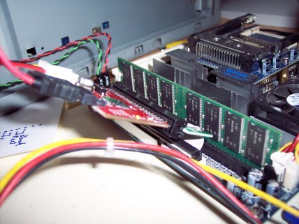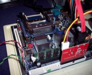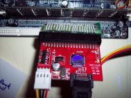 And my motherboard. You can see the SATA controller plugged into the IDE port here to make the SATA laptop drive functional.